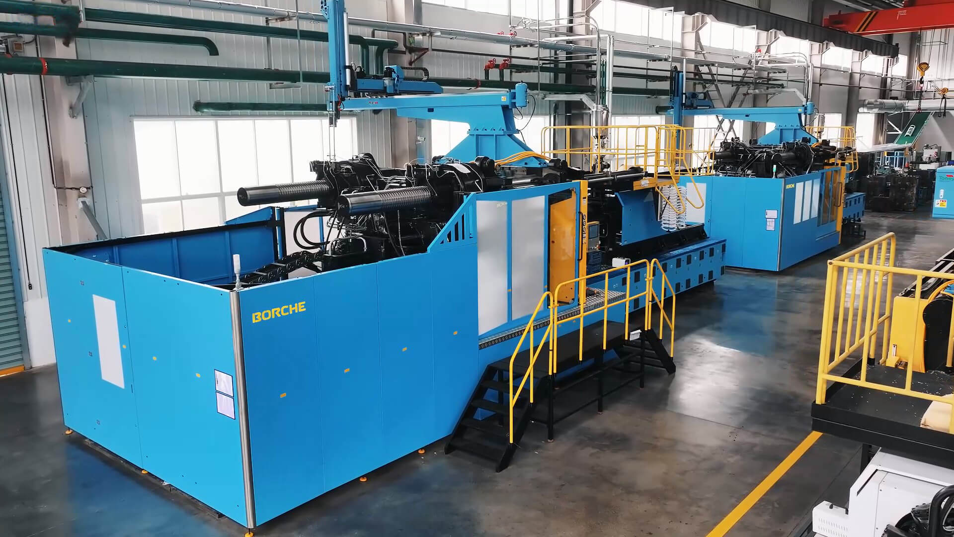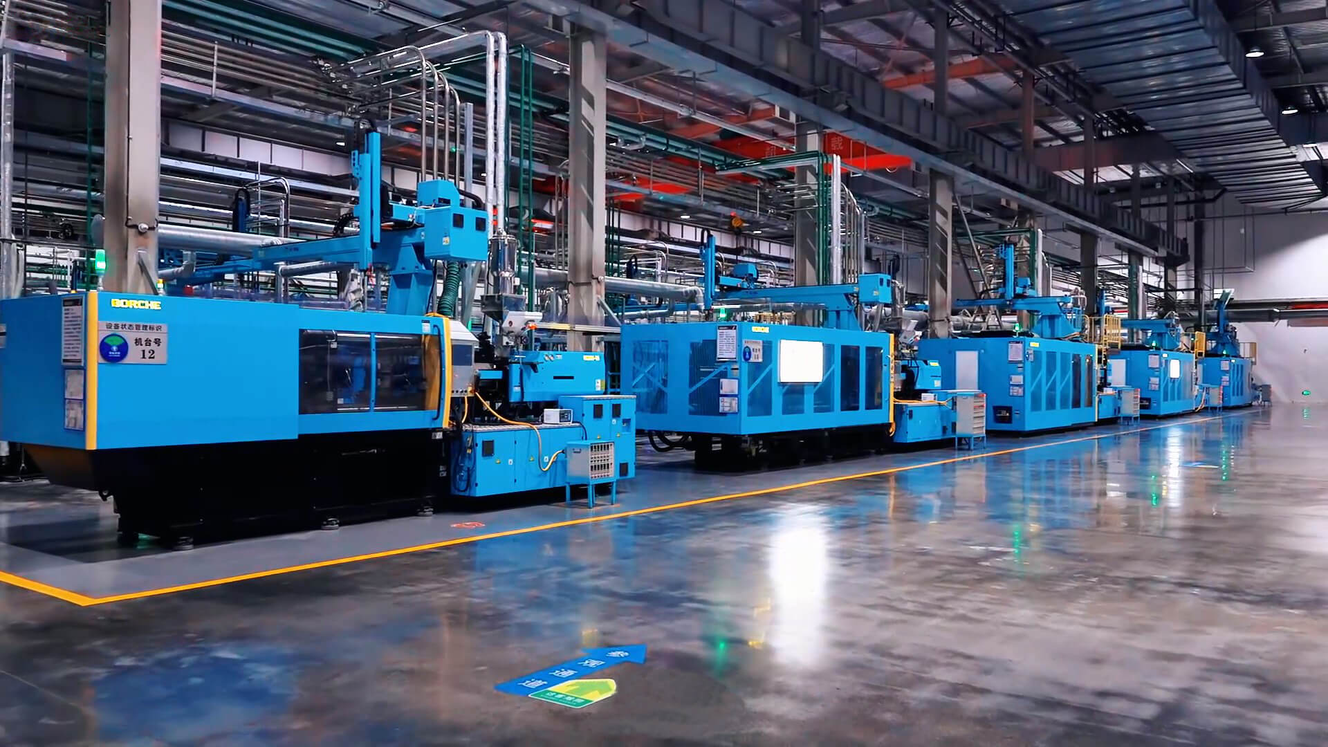 最大一臺機是博創全新一代二板智能注塑機BU2200-V,設備容模量大、運行精度高、注射量可達15000g,滿足客戶對高端產品生產的需求。