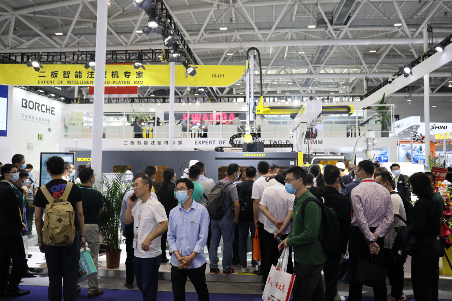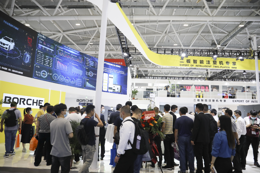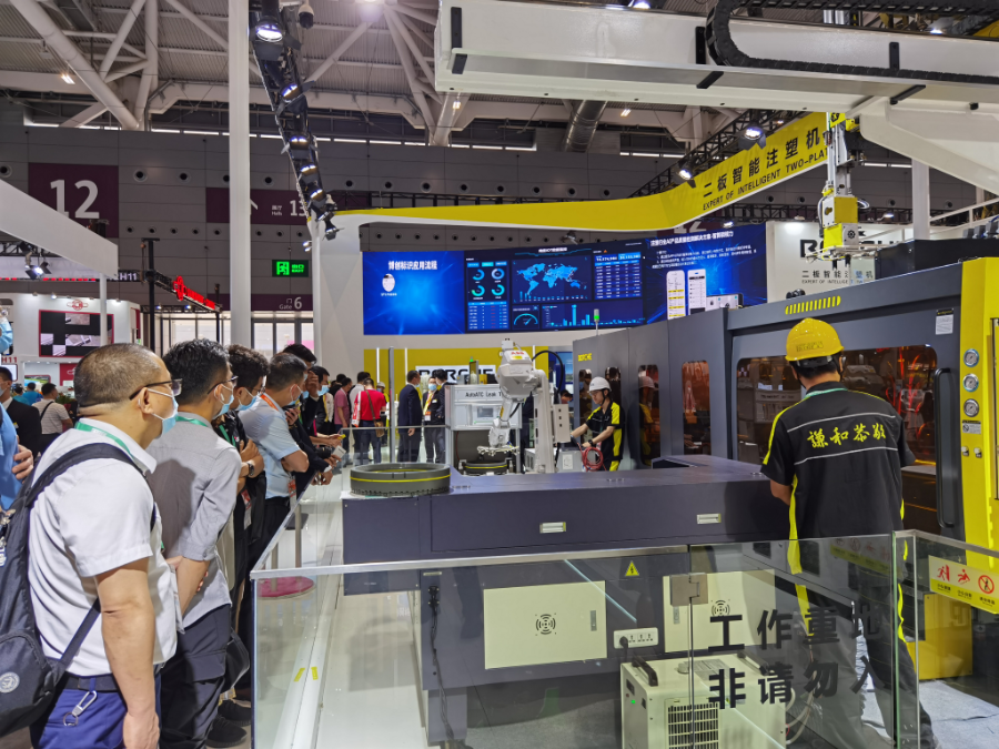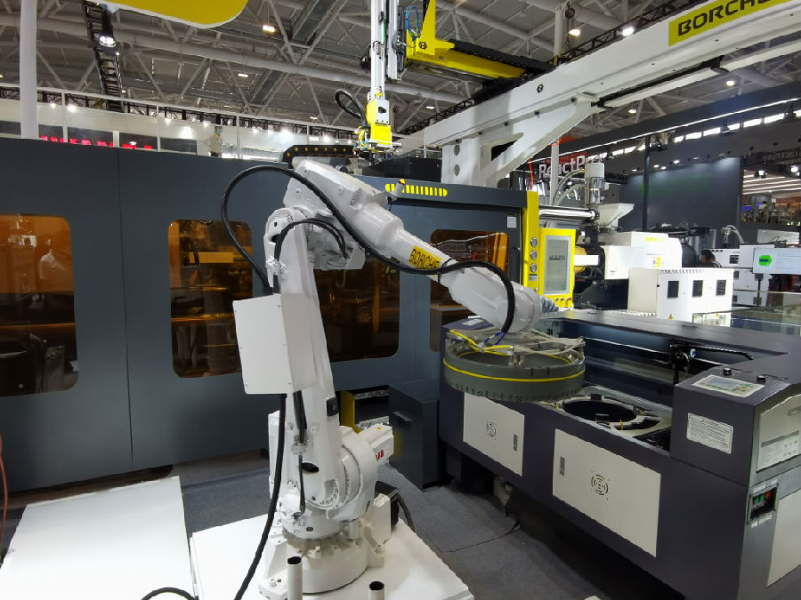 作為二板智能注塑機專家,博創在CHINAPlAS 2021上展示全新的、顛覆行業的洗衣機平衡環智能注塑生產系統。該系統以BM500-3C兩板式水平對射三色機為主機集成多個自動化設備形成注塑島。可以在人機交互界面(電腦)上實現注塑島輔助設備(冷水機、模溫機、機械手)的操作。進行注塑單元智能互聯形成智能注塑無人化生產線實現多工序制品的注塑。機械手取件、CCD檢測水口、切除水口、機器人搬運、氣密性檢測、碼垛。