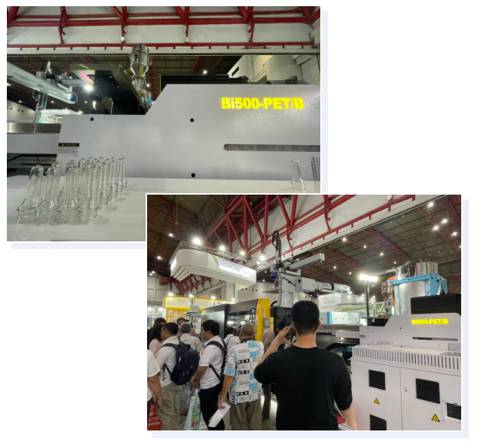 博創展位號A1-2102其中,以Bi500-PET/B為主體的瓶胚智能包裝生產線,生產14克的瓶胚,一出64,每模僅需要12秒,獲得客戶的高度認可,市場需求火熱。